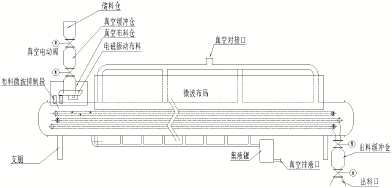 為物料的連續(xù)進(jìn)出,采用雙級真空擋板閥裝置。該裝置由進(jìn)料斗、緩沖倉、上真空擋板閥、暫存?zhèn)}、下真空擋板閥、接口等部分組成。同時,在進(jìn)料端輔以電磁布料裝置,使物料均勻分布于傳送帶上。其動作過程為,初始狀態(tài)上、下真空擋板閥均閉合,物料經(jīng)進(jìn)料斗進(jìn)入緩沖倉,達(dá)到一定質(zhì)量后,上真空擋板閥首先打開,物料進(jìn)入緩沖倉,然后上真空擋板閥關(guān)閉,下真空擋板閥打開,物料經(jīng)接口進(jìn)入設(shè)備內(nèi)部,下真空擋板閥關(guān)閉,完成一動作循環(huán),準(zhǔn)備進(jìn)入下一循環(huán)。輔助的布料裝置,了間隙時間內(nèi),物料的連續(xù)性。真空擋板閥采用電動控制,同時擋板上嵌有食品級硅橡膠密封材料用以真空密封,接口處有導(dǎo)電材料密封微波。